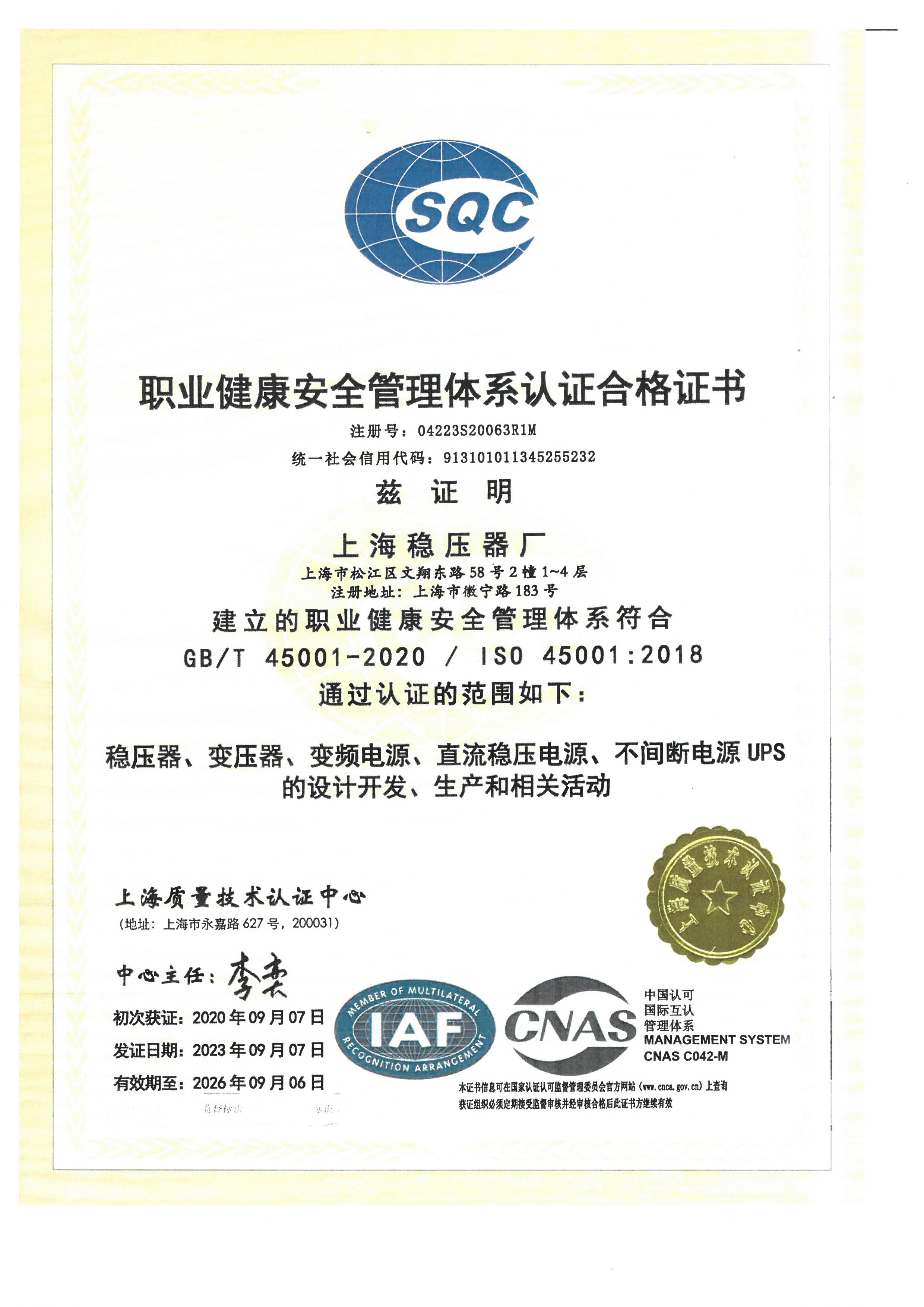 職業健康安全管理體系認證證書